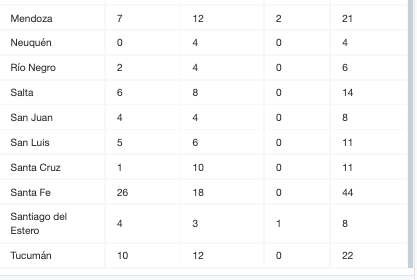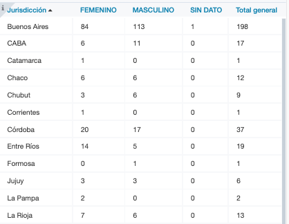 También fallecieron 84 mujeres en Buenos Aires; 6 en la Ciudad de Buenos Aires; 1 en Catamarca; 6 en Chaco; 3 en Chubut; 1 en Corrientes; 20 en Córdoba; 14 en Entre Ríos; 3 en Jujuy; 2 en La Pampa; 7 en La Rioja; 7 en Mendoza; 2 en Río Negro; 6 en Salta; 4 en San Juan; 5 en San Luis; 1 en Santa Cruz; 26 en Santa Fe; 4 en Santiago del Estero y 10 en Tucumán.