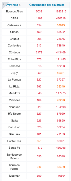 El total de acumulados por distrito indica que la provincia de Buenos Aires suma 1.922.315 casos; la Ciudad de Buenos Aires, 480.318; Catamarca, 38.643; Chaco, 85.502; Chubut, 73.675; Corrientes, 73.840; Córdoba, 443.409; Entre Ríos, 121.485; Formosa, 52.208; Jujuy, 40.331; La Pampa, 57.397; La Rioja, 25.340; Mendoza, 147.975; Misiones, 28.273; Neuquén, 104.598; Río Negro, 87.929; Salta, 69.850; San Juan, 56.284; San Luis, 71.133; Santa Cruz, 56.971; Santa Fe, 430.096; Santiago del Estero, 68.348; Tierra del Fuego, 30.489 y Tucumán, 170.804.