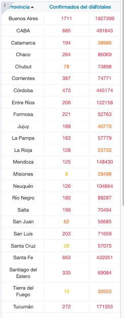 De los 6.935 contagios, 1.711 son de la provincia de Buenos Aires, 685 de la ciudad de Buenos Aires, 194 de Catamarca, 264 de Chaco, 78 de Chubut, 387 de Corrientes, 473 de Córdoba, 206 de Entre Ríos, 221 de Formosa, 189 de Jujuy, 183 de La Pampa, 128 de La Rioja, 125 de Mendoza, 8 de Misiones, 126 de Neuquén, 180 de Río Negro, 199 de Salta, 62 de San Juan, 203 de San Luis, 28 de Santa Cruz, 663 de Santa Fe, 335 de Santiago del Estero, 15 de Tierra del Fuego y 272 de Tucumán.