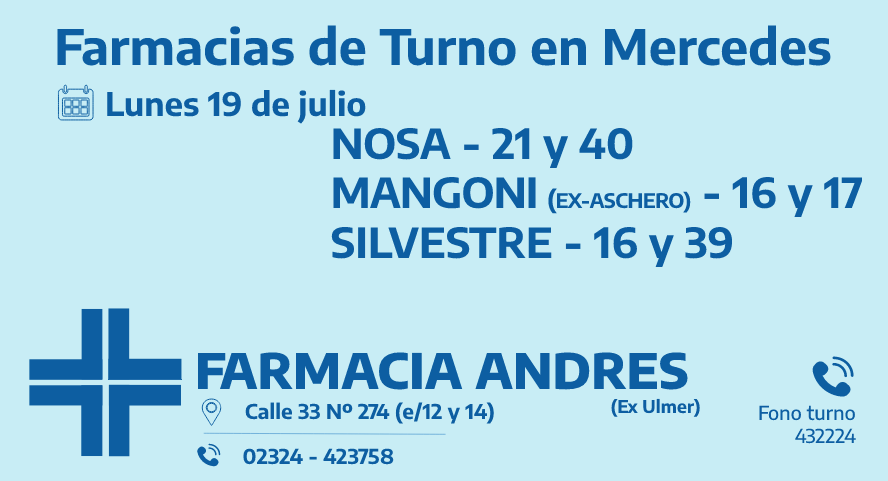 Desde las 8:30 del día de hoy hasta la misma hora de mañana, las farmacias de turno en Mercedes son: Nosa, Mangoni y Silvestre.