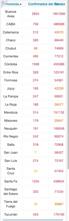 El total de acumulados por distrito indica que la provincia de Buenos Aires suma 1.951.006 casos; la Ciudad de Buenos Aires, 486.589; Catamarca, 40.570; Chaco, 88.440; Chubut, 74.959; Corrientes, 77.512; Córdoba, 455.389; Entre Ríos, 125.191; Formosa, 54.381; Jujuy, 42.239; La Pampa, 59.501; La Rioja, 26.577; Mendoza, 151.132; Misiones, 29.647; Neuquén, 106.048; Río Negro, 90.074; Salta, 72.908; San Juan, 58.427; San Luis, 73.167; Santa Cruz, 57.404; Santa Fe, 439.654; Santiago del Estero, 71.234; Tierra del Fuego, 30.867; y Tucumán, 176.193.