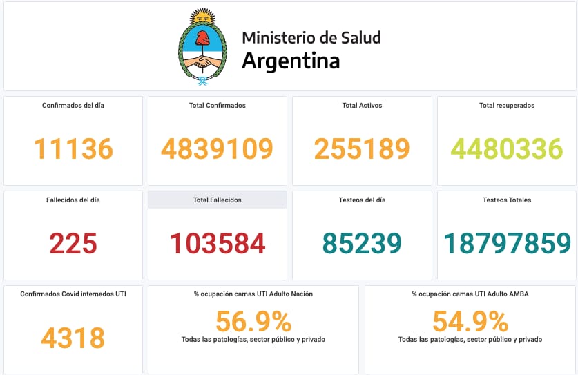 El Ministerio de Salud de la Nación informó que, en las últimas 24 horas, se registraron 225 muertes y 11.136 nuevos contagios de coronavirus. De esta manera, el total de casos desde que comenzó la pandemia asciende a 4.839.109 y los fallecimientos son 103.584.