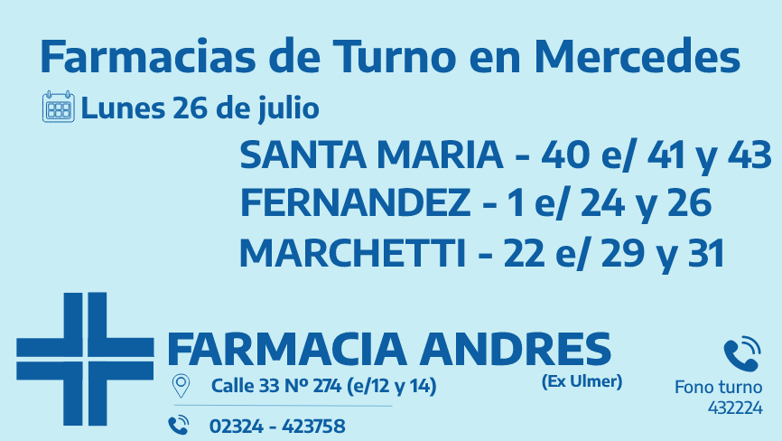 Desde las 8:30 del día de hoy, hasta la misma hora de mañana, las farmacias de turno en Mercedes son: Santa María, Fernández y Marchetti.