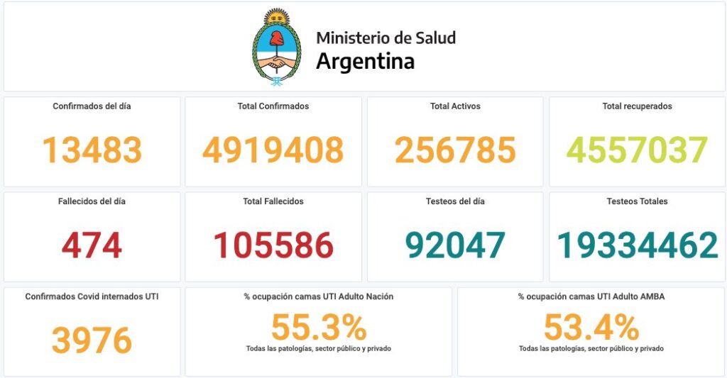 El Ministerio de Salud de la Nación informó que, en las últimas 24 horas, se registraron 474 muertes y 13.483 nuevos contagios de COVID-19. Con estos datos, el total de casos desde el inicio de la pandemia asciende a 4.919.408 y los fallecimientos son 105.586.