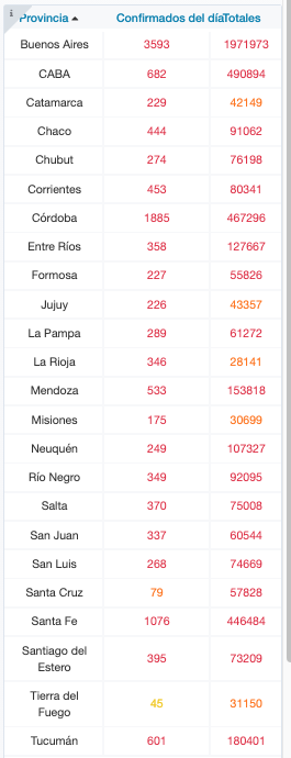 El total de acumulados por distrito indica que la provincia de Buenos Aires suma 1.971.973 casos; la Ciudad de Buenos Aires, 490.894; Catamarca, 42.149; Chaco, 91.062; Chubut, 76.198; Corrientes, 80.341; Córdoba, 467.296; Entre Ríos, 127.667; Formosa, 55.826; Jujuy, 43.357; La Pampa, 61.272; La Rioja, 28.141; Mendoza, 153.818; Misiones, 30.699; Neuquén, 107.327; Río Negro, 92.095; Salta, 75.008; San Juan, 60.544; San Luis, 74.669; Santa Cruz, 57.828; Santa Fe, 446.484; Santiago del Estero, 73.209; Tierra del Fuego, 31.150 y Tucumán, 180.401.