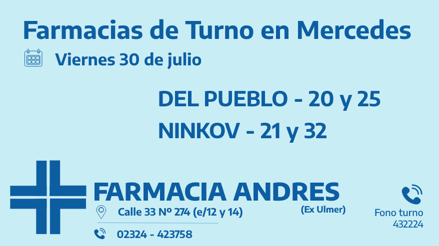 Farmacias de turno del viernes 30 de julio 30 julio, 2021Desde las 8:30 del día de hoy hasta la misma hora de mañana, las farmacias de turno en Mercedes son: Del Pueblo y Ninkov.Comparte esto: Haz clic para compartir en WhatsApp (Se abre en una ventana nueva) WhatsApp Haz clic para compartir en Telegram (Se abre en una ventana nueva) Telegram Haz clic para compartir en X (Se abre en una ventana nueva) X Haz clic para compartir en Facebook (Se abre en una ventana nueva) Facebook TE PUEDE INTERESARCOMENTARIOS Comentarios