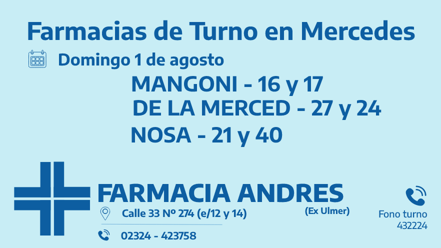 Desde las 8:30 del día de hoy hasta la misma hora de mañana, las farmacias de turno en Mercedes son: Mangoni, De la Merced y Nosa.