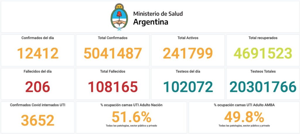 El Ministerio de Salud de la Nación informó este martes 10 de agosto que, en las últimas 24 horas, se registraron 206 muertes y 12.412 nuevos contagios de coronavirus. De esta manera, el total de casos desde el comienzo de la pandemia es de 5.041.487 y los fallecimientos son 108.165.