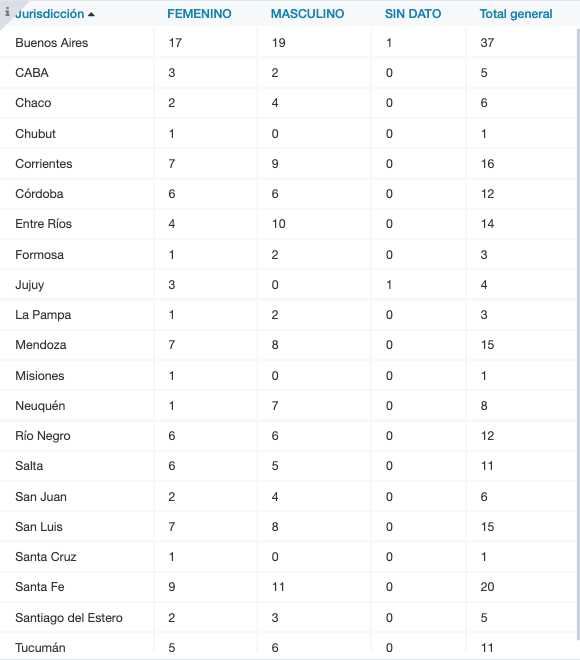 También fallecieron 17 mujeres en Buenos Aires; tres en la Ciudad de Buenos Aires; dos en Chaco; una en Chubut; 7 en Corrientes; 6 en Córdoba; 4 en Entre Ríos; una en Formosa; tres en Jujuy; una en La Pampa; 7 en Mendoza; una en Misiones; una en Neuquén; 6 en Río Negro; 6 en Salta; dos en San Juan; 7 en San Luis; una en Santa Cruz; 9 en Santa Fe; dos en Santiago del Estero y 5 en Tucumán.