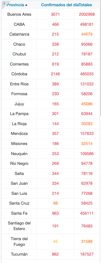 De los 12.414 nuevos contagios reportados hoy, 3.071 son de la provincia de Buenos Aires, 466 de la ciudad de Buenos Aires, 215 de Catamarca, 338 de Chaco, 212 de Chubut, 619 de Corrientes, 2.146 de Córdoba, 389 de Entre Ríos, 230 de Formosa, 165 de Jujuy, 301 de La Pampa, 144 de La Rioja, 357 de Mendoza, 186 de Misiones, 253 de Neuquén, 269 de Río Negro, 344 de Salta, 334 de San Juan, 214 de San Luis, 98 de Santa Cruz, 963 de Santa Fe, 191 de Santiago del Estero, 45 de Tierra del Fuego y 862 de Tucumán.