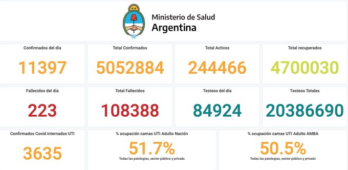 El Ministerio de Salud de la Nación informó este miércoles 11 de agosto que, en las últimas 24 horas, se registraron 223 muertes y 11.397 nuevos contagios de coronavirus. De esta manera, el total de casos desde el comienzo de la pandemia es de 5.052.884 y los fallecimientos son 108.388.