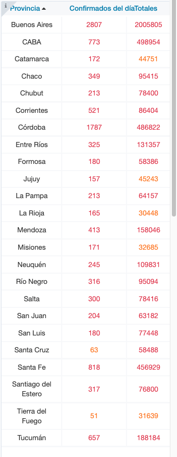 El total de acumulados por distrito indica que la provincia de Buenos Aires suma 2.005.805 casos; la Ciudad de Buenos Aires, 498.954; Catamarca, 44.751; Chaco, 95.415; Chubut, 78.400; Corrientes, 86.404; Córdoba, 486.822; Entre Ríos, 131.357; Formosa, 58.386; Jujuy, 45.243; La Pampa, 64.154; La Rioja, 30.448; Mendoza, 158.046; Misiones, 32.685; Neuquén, 109.831; Río Negro, 95.094; Salta, 78.416; San Juan, 63.182; San Luis, 77.448; Santa Cruz, 58.488; Santa Fe, 456.929; Santiago del Estero, 76.800; Tierra del Fuego, 31.639; y Tucumán, 188.184.