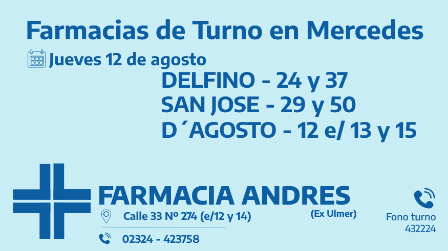 Desde las 8:30 del día de hoy hasta la misma hora de mañana, las farmacias de turno en Mercedes son: Delfino, San José y D’Agosto.