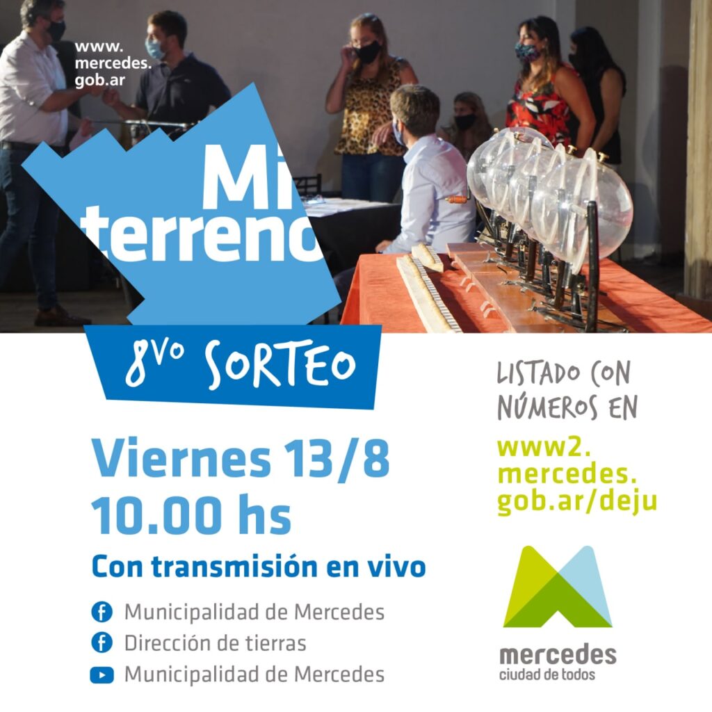 El viernes 13 de agosto, a partir de la hora 10, se realizará un nuevo sorteo del Programa «Mi Terreno». El sorteo será transmitido en vivo, vía streaming, a través de las redes sociales del Municipio de Mercedes, la Dirección de Tierras y de la del Intendente Ustarroz. Los incriptos pueden verificar su número en el sitio web de la comuna: http://www2.mercedes.gob.ar/deju/