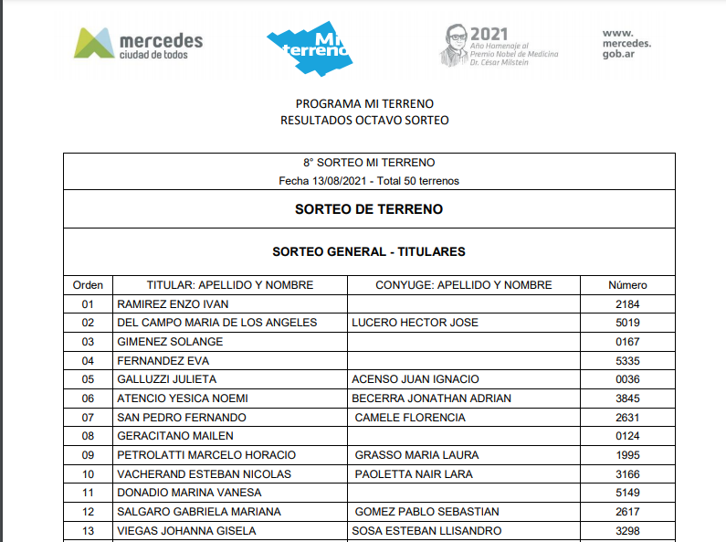 El listado completo de los sorteados se encuentra online en: http://www2.mercedes.gob.ar/deju De allí, pueden surgir al objeciones de cualquier vecino si observa que alguno de los beneficiarios no cumple con los requisitos para el Programa Mi Terreno. En caso de existir algún tipo de objeción o duda, se puede consultar a la Dirección de Tierras.