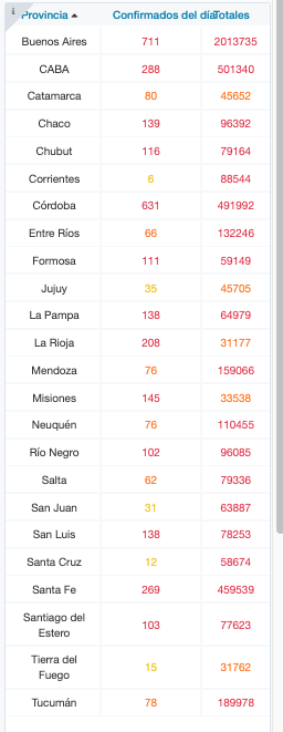 El total de acumulados por distrito indica que la provincia de Buenos Aires suma 2.013.735 casos; la Ciudad de Buenos Aires, 501.340; Catamarca, 45.652; Chaco, 96.392; Chubut, 79.164; Corrientes, 88.544; Córdoba, 491.992; Entre Ríos, 132.246; Formosa, 59.149; Jujuy, 45.705; La Pampa, 64.979; La Rioja, 31.177; Mendoza, 159.066; Misiones, 33.538; Neuquén, 110.455; Río Negro, 96.085; Salta, 79.336; San Juan, 63.887; San Luis, 78.253.; Santa Cruz, 58.674; Santa Fe, 459.539; Santiago del Estero, 77.623; Tierra del Fuego, 31.762; y Tucumán, 189.978.