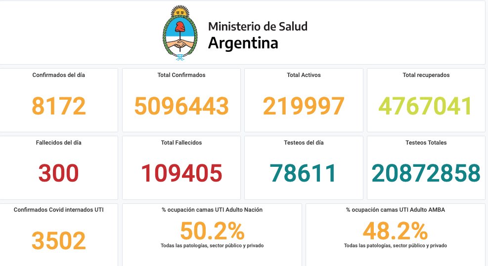 El Ministerio de Salud reportó otras 300 muertes y 8.172 casos positivos de coronavirus. Con estos datos, suman 109.405 los fallecidos y 5.096.443 los contagiados desde el inicio de la pandemia.