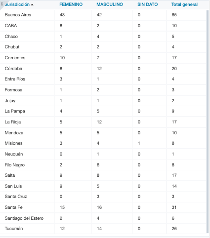 Del total de muertes reportadas este martes, 156 son hombres (42 de la provincia de Buenos Aires, 2 de la ciudad de Buenos Aires, 4 de Chaco, 2 de Chubut, 7 de Corrientes, 12 de Córdoba, 1 de Entre Ríos, 2 de Formosa, 1 Jujuy, 5 de La Pampa, 12 de La Rioja, 5 Mendoza, 4 de Misiones, 1 de Neuquén, 6 de Río Negro, 8 de Salta, 5 de San Luis, 3 de Santa Cruz, 16 de Santa Fe, 4 de Santiago del Estero y 14 de Tucumán) y 143 son mujeres (43 de la provincia de Buenos Aires, 8 de la ciudad de Buenos Aires, 1 de Chaco, 2 de Chubut, 10 de Corrientes, 8 de Córdoba, 3 de Entre Ríos, 1 de Formosa, 1 Jujuy, 4 de La Pampa, 5 de La Rioja, 5 Mendoza, 3 de Misiones, 2 de Río Negro, 9 de Salta, 9 de San Luis, 15 de Santa Fe, 2 de Santiago del Estero y 12 de Tucumán).