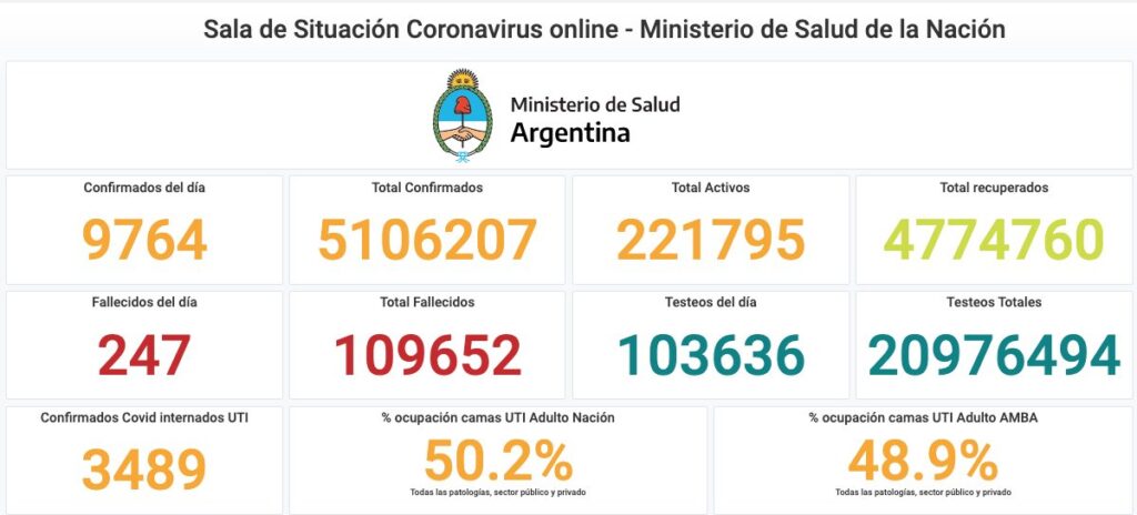 El Ministerio de Salud de la Nación informó este miércoles 18 de agosto que, en las últimas 24 horas, se registraron 247 muertes y 9.764 nuevos contagios de coronavirus. Con estas cifras, el país acumula un total de 5.106.207 casos desde el comienzo de la pandemia, mientras que los fallecimientos son 109.652.