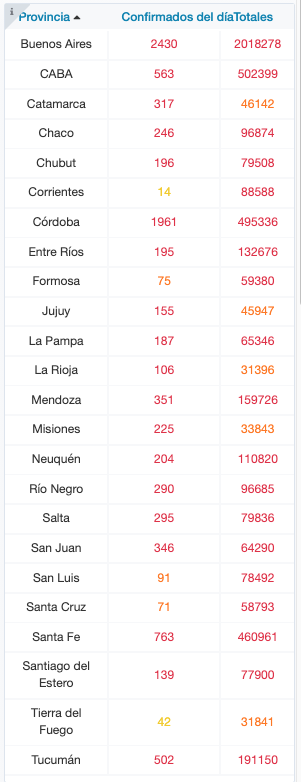 De los 9.764 nuevos contagios reportados hoy, 2.430 son de la provincia de Buenos Aires, 563 de la ciudad de Buenos Aires, 317 de Catamarca, 246 de Chaco, 196 de Chubut, 14 de Corrientes, 1.961 de Córdoba, 195 de Entre Ríos, 75 de Formosa, 155 de Jujuy, 187 de La Pampa, 106 de La Rioja, 351 de Mendoza, 225 de Misiones, 204 de Neuquén, 290 de Río Negro, 295 de Salta, 346 de San Juan, 91 de San Luis, 71 de Santa Cruz, 763 de Santa Fe, 139 de Santiago del Estero, 42 de Tierra del Fuego y 502 de Tucumán.