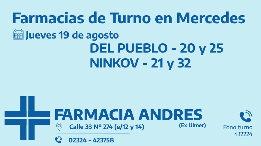 Farmacias de turno del jueves 19 de agosto 19 agosto, 2021Desde las 8:30 del día de hoy hasta la misma hora de mañana, las farmacias de turno en Mercedes son: Del Pueblo y Ninkov.Comparte esto: Haz clic para compartir en WhatsApp (Se abre en una ventana nueva) WhatsApp Haz clic para compartir en Telegram (Se abre en una ventana nueva) Telegram Haz clic para compartir en X (Se abre en una ventana nueva) X Haz clic para compartir en Facebook (Se abre en una ventana nueva) Facebook TE PUEDE INTERESARCOMENTARIOS Comentarios