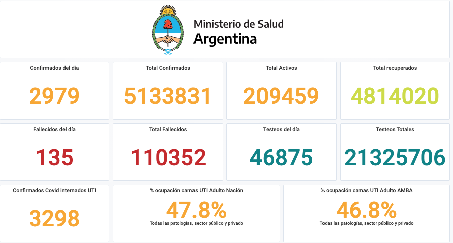 El Ministerio de Salud de la Nación informó este domingo 22 de agosto que, se registraron 135 muertes y 2.979 nuevos contagios de coronavirus. De esta manera, el total de casos en el país desde que comenzó la pandemia aumentó a 5.133.831, mientras que los fallecimientos son 110.352.