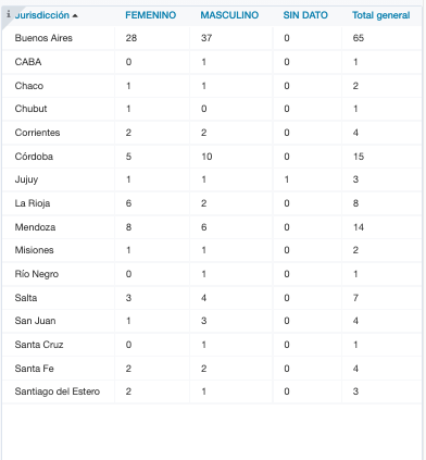 Del total de muertes reportadas hoy, 73 son hombres (37 son de la provincia de Buenos Aires, uno de la ciudad de Buenos Aires, uno de Chaco, dos de Corrientes, diez de Córdoba, uno de Jujuy, dos de La Rioja, seis de Mendoza, uno de Misiones, uno de Río Negro, cuatro de Salta, tres de San Juan, uno de Santa Cruz, dos de Santa Fe y uno de Santiago del Estero) y 61 son mujeres (28 son de la provincia de Buenos Aires, una de Chaco, una de Chubut, dos de Corrientes, cinco de Córdoba, una de Jujuy, seis de La Rioja, ocho de Mendoza, una de Misiones, tres de Salta, una de San Juan, dos de Santa Fe y dos de Santiago del Estero).