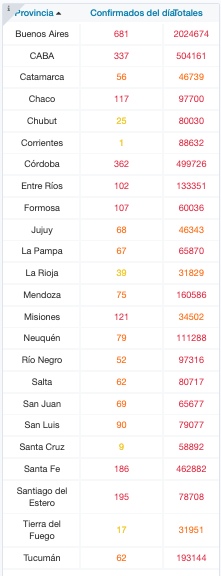 Este domingo se registraron en la provincia de Buenos Aires 681 casos, en la Ciudad de Buenos Aires 337, en Catamarca 56, en Chaco 117, en Chubut 25, en Corrientes 1, en Córdoba 362, en Entre Ríos 102, en Formosa 107, en Jujuy 68, en La Pampa 67, en La Rioja 39, en Mendoza 75, en Misiones 121, en Neuquén 79, en Río Negro 52, en Salta 62, en San Juan 69, en San Luis 90, en Santa Cruz 9, en Santa Fe 186, en Santiago del Estero 195, en Tierra del Fuego 17 y en Tucumán 62.