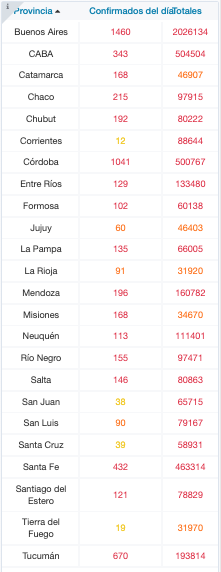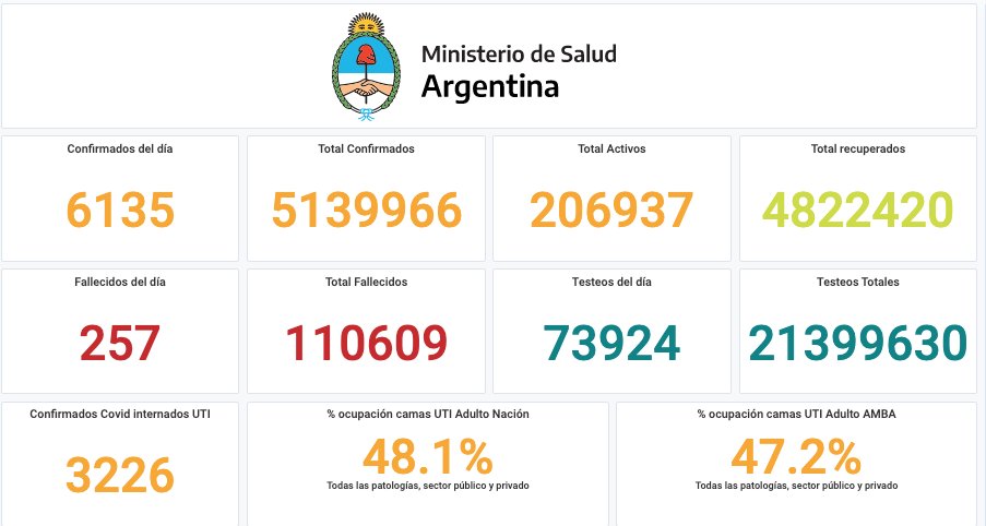 De los 6.135 nuevos contagios notificados esta tarde, 1.460 son de la provincia de Buenos Aires, 343 de la ciudad de Buenos Aires, 168 de Catamarca, 215 de Chaco, 192 de Chubut, 12 de Corrientes, 1.041 de Córdoba, 129 de Entre Ríos, 102 de Formosa, 60 de Jujuy, 135 de La Pampa, 91 de La Rioja, 196 de Mendoza, 168 de Misiones, 113 de Neuquén, 155 de Río Negro, 146 de Salta, 38 de San Juan, 90 de San Luis, 39 de Santa Cruz, 432 de Santa Fe, 121 de Santiago del Estero, 19 de Tierra del Fuego y 670 de Tucumán.
