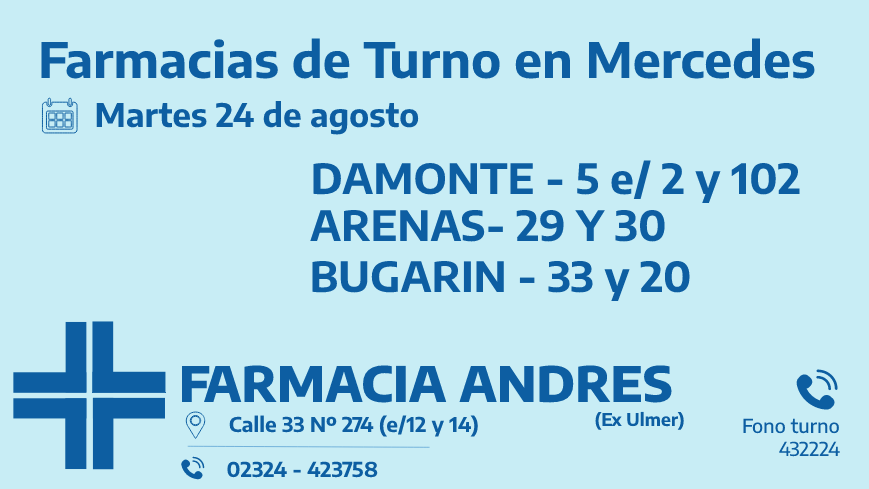 Desde las 8:30 del día de hoy hasta la misma hora de mañana, las farmacias de turno en Mercedes son: Damonte, Arenas y Bugarín.