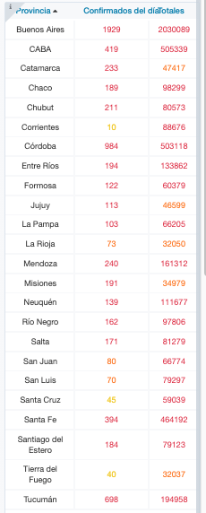 El total de acumulados por distrito indica que la provincia de Buenos Aires suma 2.030.089, la Ciudad de Buenos Aires 505.339, Catamarca 47.417, Chaco 98.299, Chubut 80.573, Corrientes 88.676, Córdoba 503.118, Entre Ríos 133.862, Formosa 60.379, Jujuy 46.599, La Pampa 66.205, La Rioja 32.050, Mendoza 161.312, Misiones 34.979, Neuquén 111.677, Río Negro 97.806, Salta 81.279, San Juan 66.774, San Luis 79.297, Santa Cruz 59.039, Santa Fe 464.192, Santiago del Estero 79.123, Tierra del Fuego 32.037 y Tucumán 194.958.