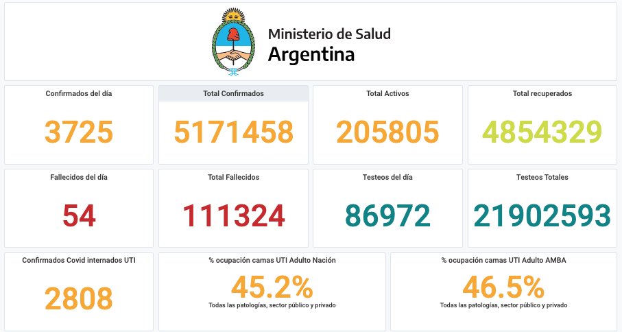 El Ministerio de Salud de la Nación informó este sábado que, en las últimas 24 horas, se registraron 54 muertes y 3.725 nuevos contagios de coronavirus. Con estos datos, el total de casos acumulado desde el comienzo de la pandemia ascendió a 5.171.458. En tanto, los fallecimientos son 111.324.