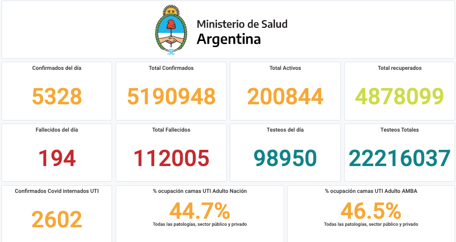 El Ministerio de Salud de la Nación informó este miércoles 1° de septiembre que se registraron 194 muertes y 5.328 nuevos contagios de coronavirus. Con estas cifras, el país acumula un total de 5.190.948 casos desde el comienzo de la pandemia, mientras que los fallecimientos son 112.005.