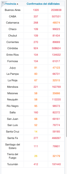 El total de acumulados por distrito indica que la provincia de Buenos Aires suma 2.038.838 casos; la Ciudad de Buenos Aires, 507.531; Catamarca, 48.574; Chaco, 99.023.; Chubut, 81.434; Corrientes, 89.669; Córdoba, 508.624; Entre Ríos, 134.632; Formosa, 61.017; Jujuy, 47.123; La Pampa, 66.731; La Rioja, 32.515; Mendoza, 162.769; Misiones, 35.666; Neuquén, 112.220; Río Negro, 98.573; Salta, 82.272; San Juan, 69.161; San Luis, 79.774; Santa Cruz, 59.185; Santa Fe, 466.097; Santiago del Estero, 79.901; Tierra del Fuego, 32.179 y Tucumán, 197.440.