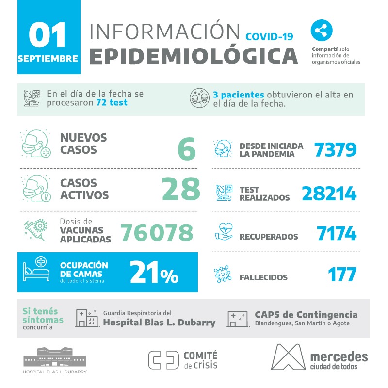 En el informe epidemiológico de este miércoles brindado por las autoridades comunales en relación al covid-19 en Mercedes, informan que son 6 los nuevos casos positivos entre los 72 análisis procesados en el día de la fecha. Asimismo, dan cuenta de que tres pacientes obtuvieron el alta.