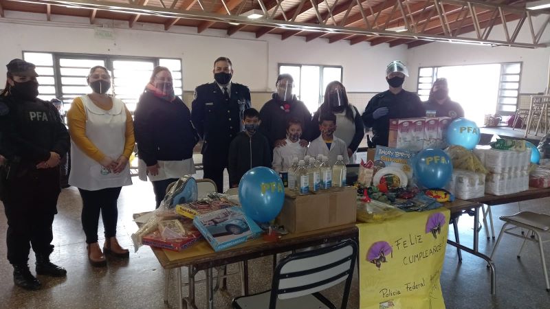 En esta oportunidad, los agentes federales llevaron resmas de papel, botellas de alcohol en gel, harina, garbanzos, chocolate en polvo, arroz, galletitas, leche en polvo, azúcar, como así también, ropa, golosinas y juguetes. Elementos que el personal policial donó con el fin de ayudar a la escuela primaria, a su comedor escolar, y colaborar con la vuelta a la presencialidad plena.