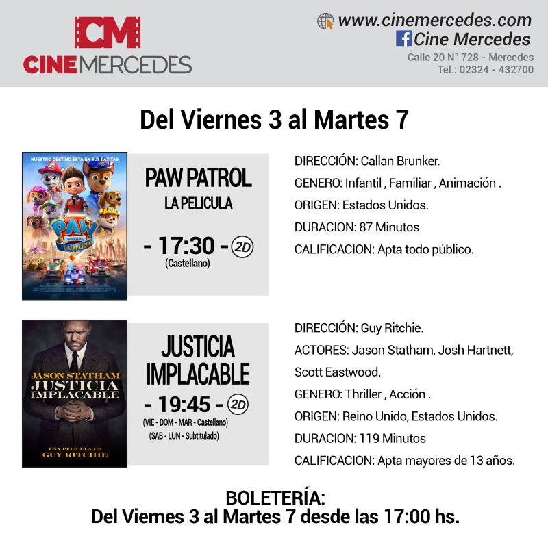 Desde el viernes 3 hasta el martes 7 de septiembre, el Cine Mercedes presentará en la primera función la película infantil «Paw Patrol» (17:30 horas), mientras que en la función siguiente (19:45 horas) el thriller de acción «Justicia Implacable» completa la cartelera. Cabe recordar que el cine local funciona con protocolos, por lo tanto, es necesario adquirir las entradas con anticipación.