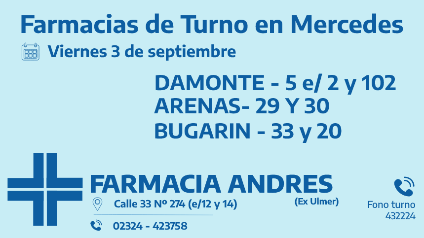 Desde las 8:30 del día de hoy hasta la misma hora de mañana, las farmacias de turno en Mercedes son: Damonte, Arenas y Bugarín.