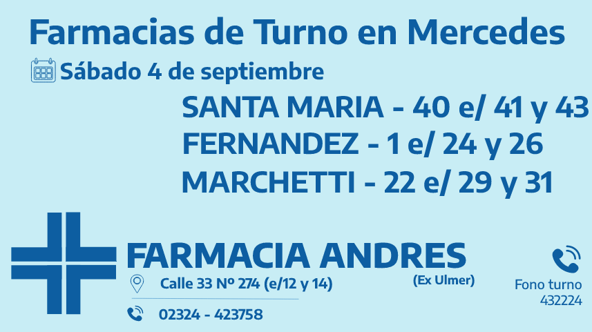 Desde las 8:30 del día de hoy, hasta la misma hora de mañana, las farmacias de turno en Mercedes: Santa María, Fernández y Marchetti.