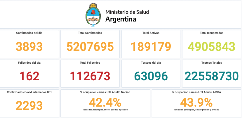 El Ministerio de Salud de la Nación informó este lunes 6 de septiembre que, en las últimas 24 horas, se registraron 162 muertes y 3.893 nuevos contagios de coronavirus. Con estas cifras, el país acumula un total de 5.207.695 casos desde el comienzo de la pandemia, mientras que los fallecimientos son 112.673.