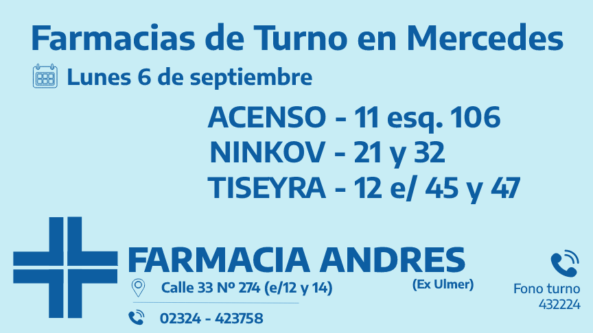 Desde las 8:30 del día de hoy, hasta la misma hora de mañana las farmacias de turno en Mercedes son: Acenso, Ninkov y Tiseyra.
