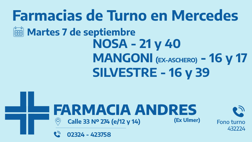 Desde las 8:30 del día de hoy hasta la misma hora de mañana, las farmacias de turno en Mercedes son: Nosa, Mangoni y Silvestre.