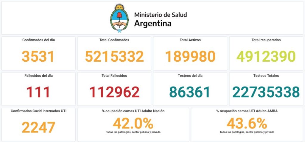 El Ministerio de Salud informó este miércoles que 111 personas fallecieron y 3.531 fueron reportadas con coronavirus. Con estas cifras, suman 112.962 los fallecidos registrados oficialmente a nivel nacional y 5.215.332 los contagiados desde el inicio de la pandemia.