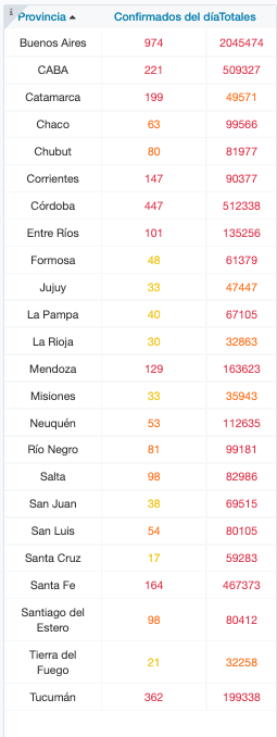 De los 3.531 nuevos contagios, 974 son de la provincia de Buenos Aires, 221 de la ciudad de Buenos Aires, 199 de Catamarca, 63 de Chaco, 80 de Chubut, 147 de Corrientes, 447 de Córdoba, 101 de Entre Ríos, 48 de Formosa, 33 de Jujuy, 40 de La Pampa, 30 de La Rioja, 129 de Mendoza, 33 de Misiones, 53 de Neuquén, 81 de Río Negro, 98 de Salta, 38 de San Juan, 54 de San Luis, 17 de Santa Cruz, 164 de Santa Fe, 98 de Santiago del Estero, 21 de Tierra del Fuego y 362 de Tucumán.