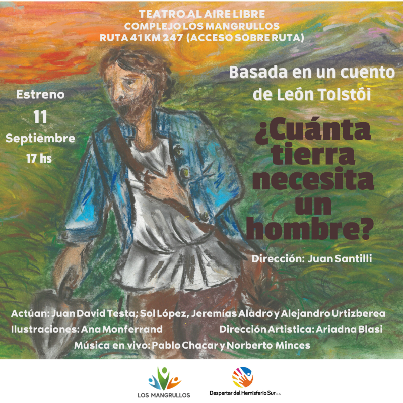 El próximo sábado 11 de septiembre, en el Complejo Los Mangrullos, ubicado en ruta 41 km 247, a las 17 hs, se estrenará la obra de teatro ¿Cuánta tierra necesita un hombre?, basada en un cuento de León Tolstói, con músicos en vivo.