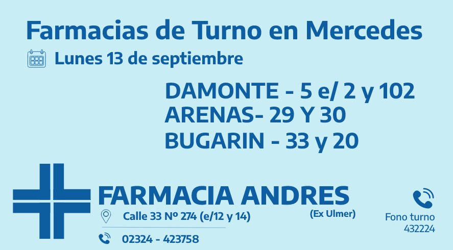 Desde las 8:30 del día de hoy hasta la misma hora de mañana, las farmacias de turno en Mercedes son: Damonte, Arenas y Bugarín.