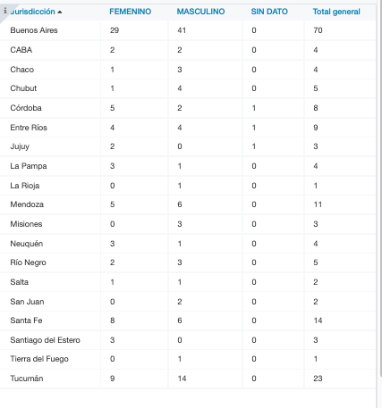 También fallecieron 29 mujeres en Buenos Aires;dos en la Ciudad de Buenos Aires; tres en Chaco; cuatro en Chubut; dos en Córdoba; cuatro en Entre Ríos; dos en Jujuy; tres en La Pampa; cinco en Mendoza; tres en Neuquén; dos en Río Negro; una en Salta; ocho en Santa Fe; tres en Santiago del Estero y nueve en Tucumán.