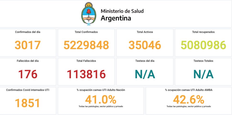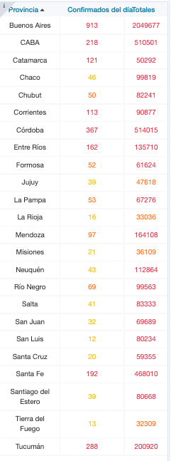 De los 3.017 nuevos contagios notificados esta tarde, 913 son de la provincia de Buenos Aires, 218 de la ciudad de Buenos Aires, 121 de Catamarca, 46 de Chaco, 50 de Chubut, 113 de Corrientes, 367 de Córdoba, 162 de Entre Ríos, 52 de Formosa, 39 de Jujuy, 53 de La Pampa, 16 de La Rioja, 97 de Mendoza, 21 de Misiones, 43 de Neuquén, 69 de Río Negro, 41 de Salta, 32 de San Juan, 12 de San Luis, 20 de Santa Cruz, 192 de Santa Fe, 39 de Santiago del Estero, 13 de Tierra del Fuego y 288 de Tucumán.