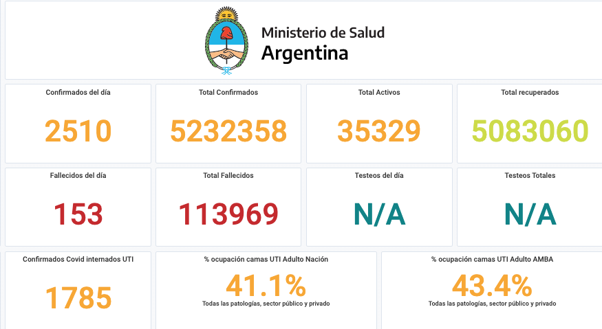 El Ministerio de Salud de la Nación informó este miércoles 15 de septiembre que se registraron 153 muertes y 2.510 nuevos contagios de coronavirus. De esta manera, el país acumula un total de 5.232.358 casos positivos desde el comienzo de la pandemia, mientras que los fallecimientos son 113.969.