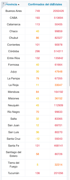 El total de acumulados por distrito indica que la provincia de Buenos Aires suma 2.050.426 casos; la Ciudad de Buenos Aires, 510.694; Catamarca, 50.405; Chaco, 99.859; Chubut, 82.327; Corrientes, 90.978; Córdoba, 514.311; Entre Ríos, 135.842; Formosa, 61.664; Jujuy, 47.648; La Pampa, 67.355; La Rioja, 33.047; Mendoza, 164.192; Misiones, 36.152; Neuquén, 112.909; Río Negro, 99.633; Salta, 83.365; San Juan, 69.701; San Luis, 80.270; Santa Cruz, 59.343; Santa Fe, 468.141; Santiago del Estero, 80.726; Tierra del Fuego, 32.314; y Tucumán, 201.056.